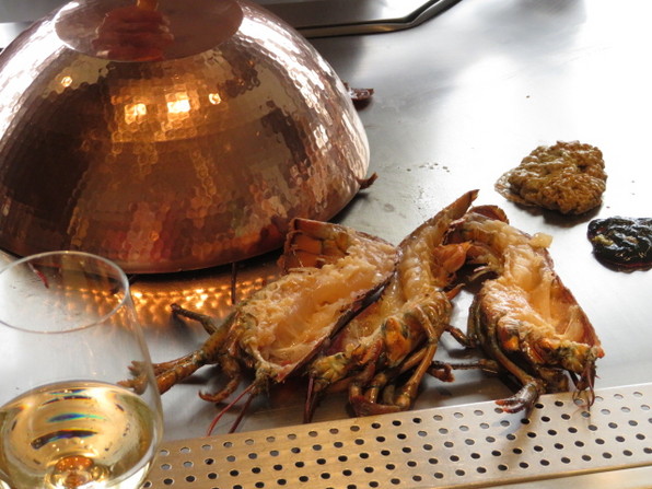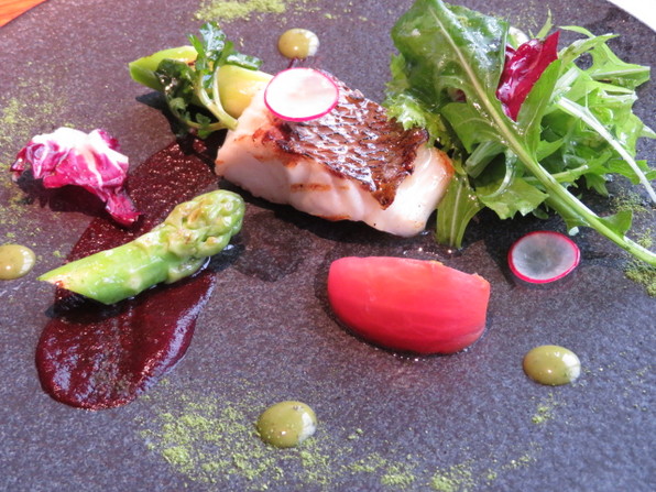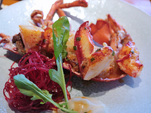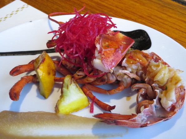 コースは前菜ののち、鯛のグリル、冷製ポタージュスープ、活けオマール海老、国産牛フィレ肉、ガーリックライス、デセール、食後の飲み物といただきました。