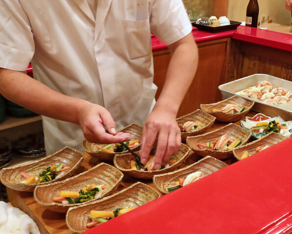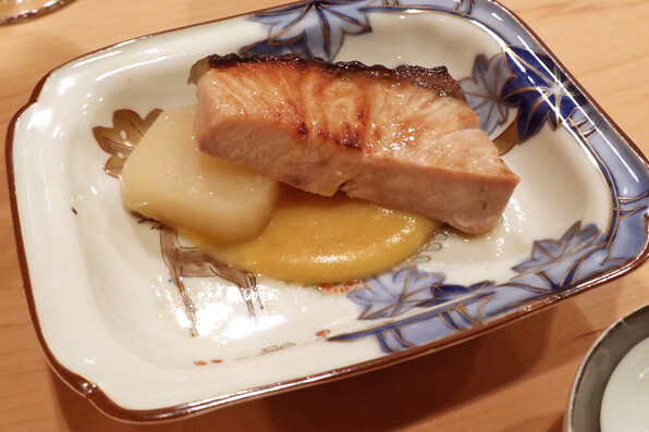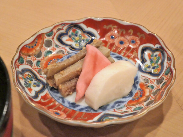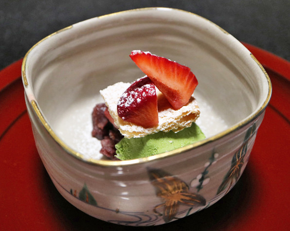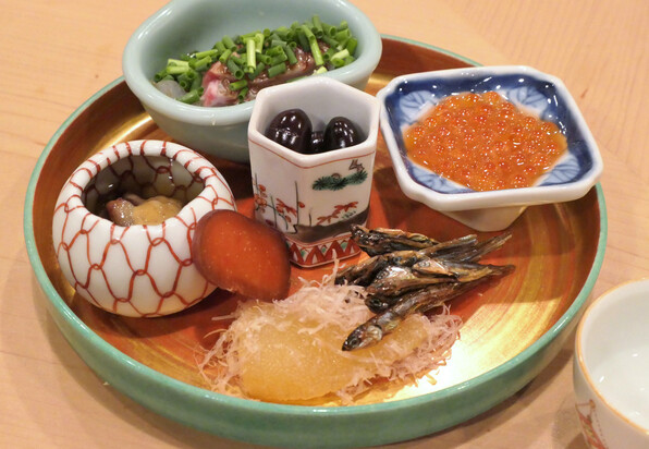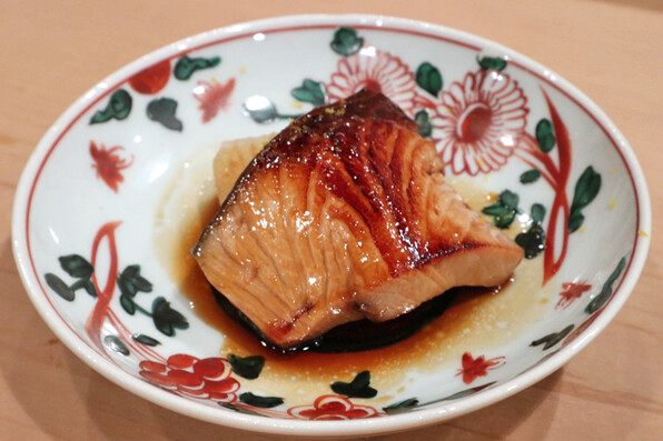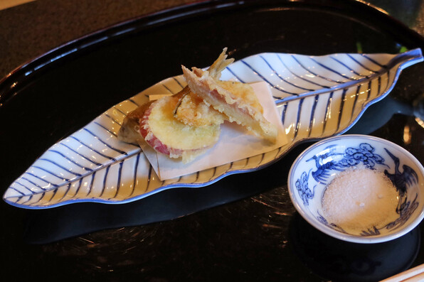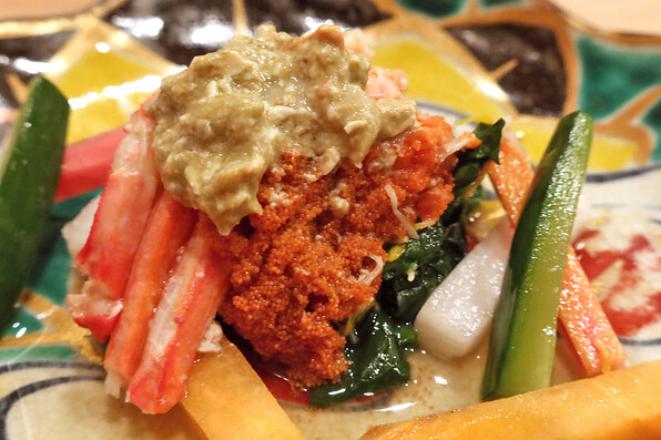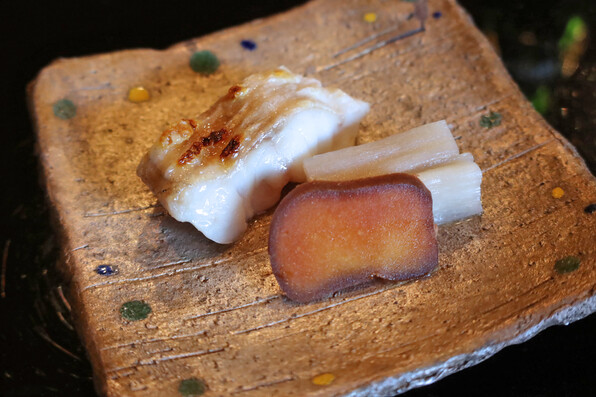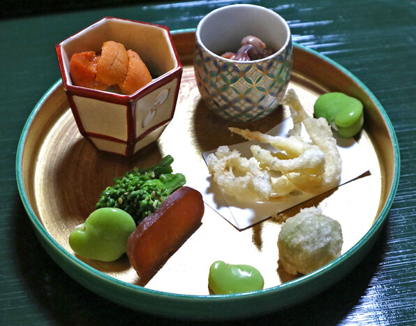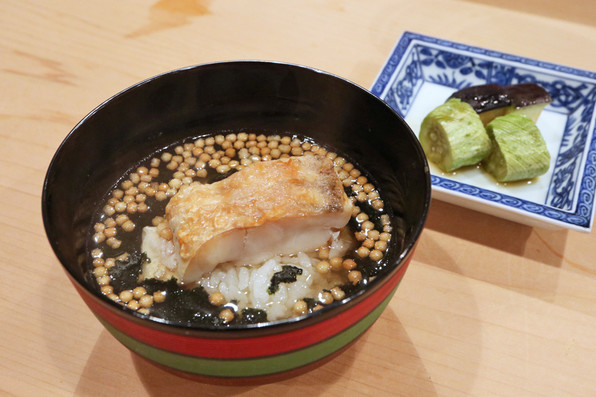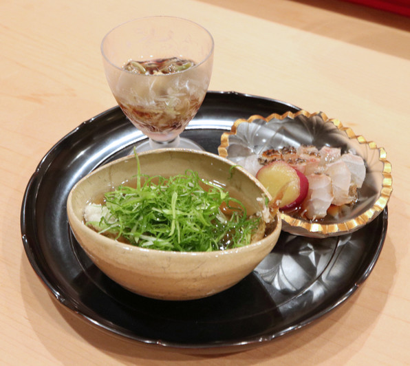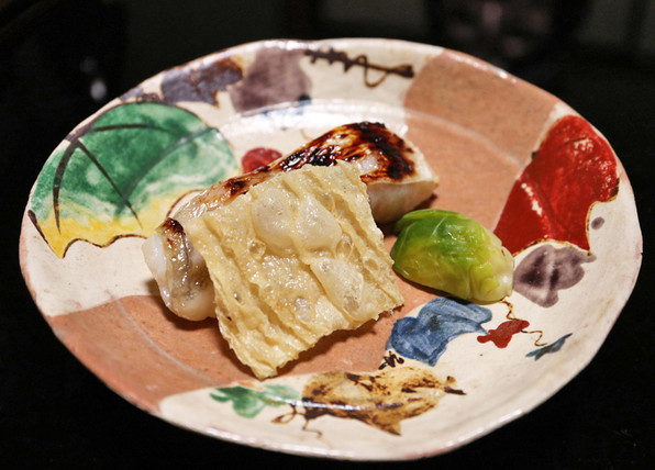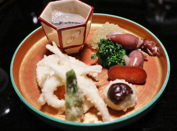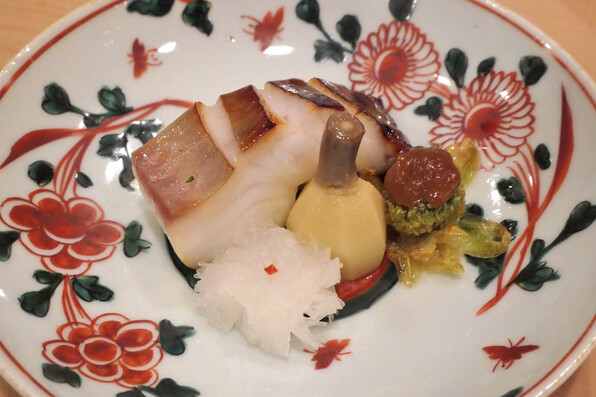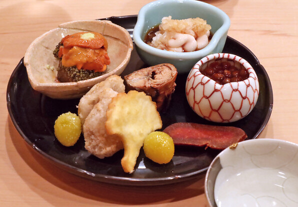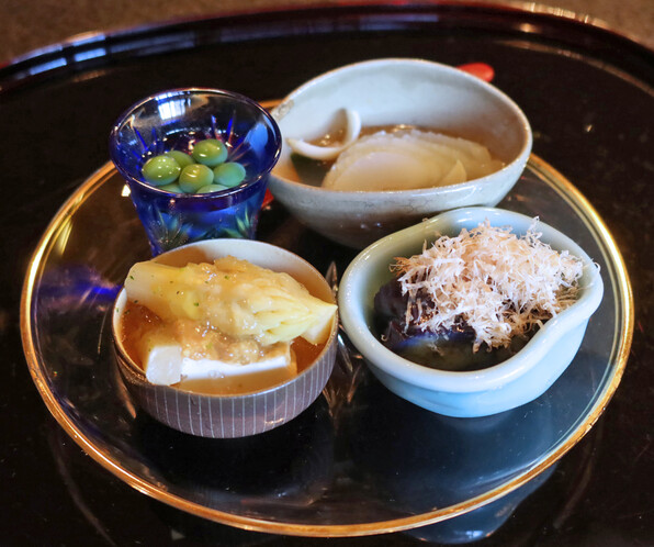 ●八寸は冷たい茄子やいちじくといんげん胡麻ソースで、夏らしさを感じさせました。他に蛸、穴子、焼いたぐじ。