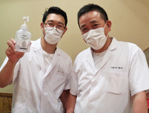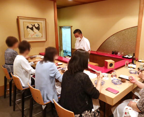 「祇園にしむら」さん、うちわが壁一面貼られて祇園情緒色濃く、常連のお客さまでいっぱい。