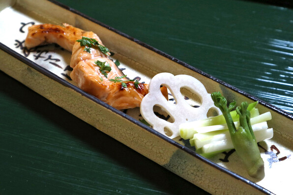 ●鮎は賀茂茄子、万願寺とうがらしと共に、甘酢あんで。