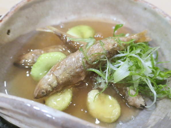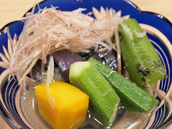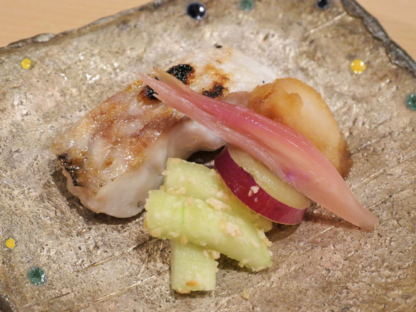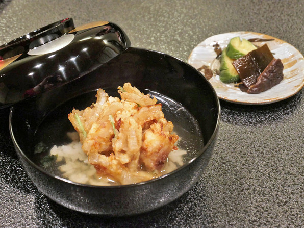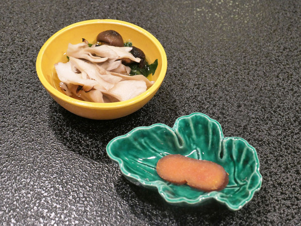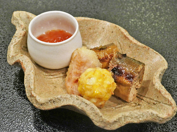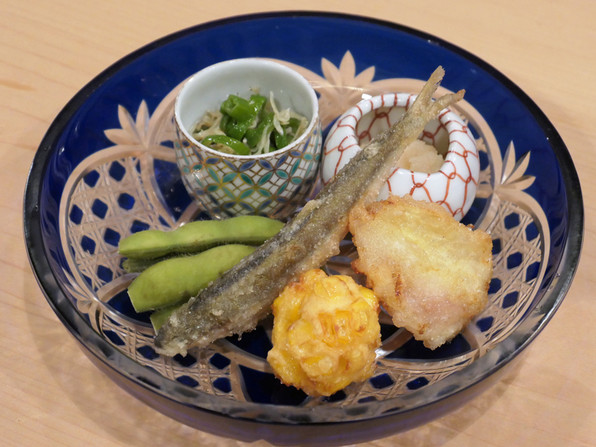 ●鱧の子の塩辛にいくら/いちじく天ぷら、とうもろこし天ぷら、子持ち鮎の山椒煮