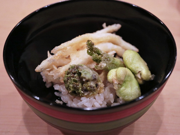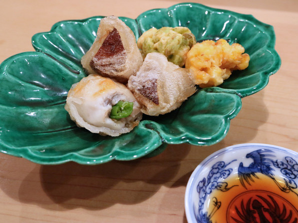 ●揚げもの:松茸、伏見とうがらしを鱧で巻き、ライスペーパーで包んで揚げたもの、これはここで初めての料理。とうもろこしかき揚げ、枝豆かき揚げ