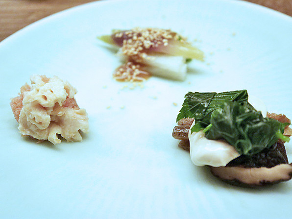 ●酒肴盛り合わせ。右側がモロヘイア、白和え衣、椎茸、こんにゃく、利休麸/左側が塩たらこの粕漬け/奥が、