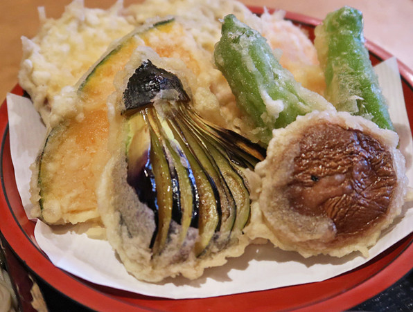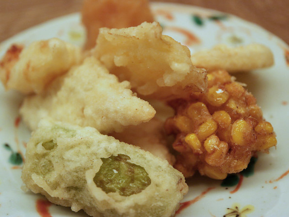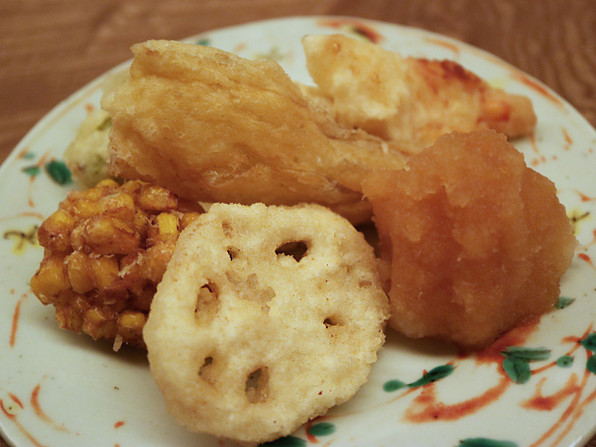 ●天ぷらはたっぷり山盛り感がありました。幸せ。れんこん、とうもろこし、おくらの花、とうがらし、煮穴子、海老。大根おろし。