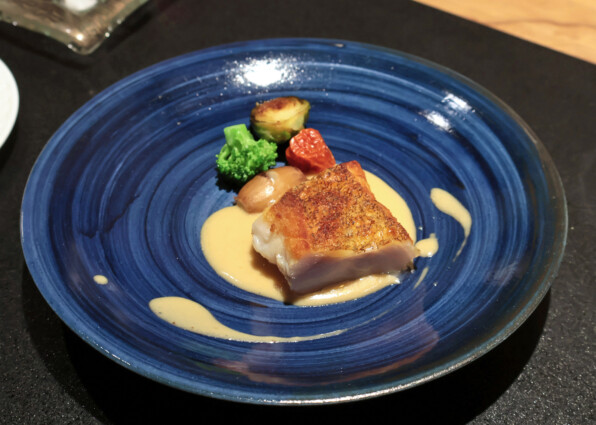 パリパリ、ふっくらと魚の焼き加減絶妙なこと、ノイリープラットの風味も粋なハーブのソースがよく調和して、
