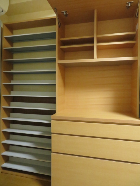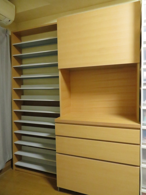 ●これは高さ180cmの棚を取り払った後に入れた新しい棚の組み立て前。高さを抑えて、圧迫感のないようにしました。