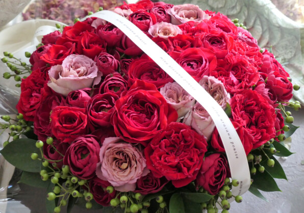 バラに、南天、餅花、水引、松葉をあしらって、すばらしい調和。マッカできれいでしょうがない。