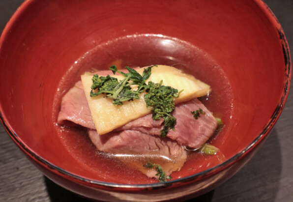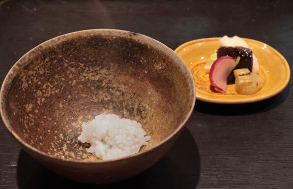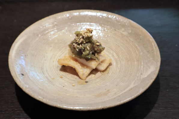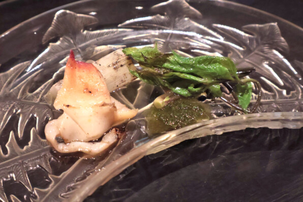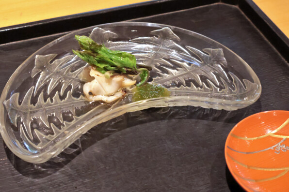 ●おおとり貝。焼いたヤングコーン、揚げたヤングコーンのひげ。アスパラガス。れんげの花の塩漬けを混ぜ込んだ土佐酢ジュレ、上からおろしたレモンの皮。