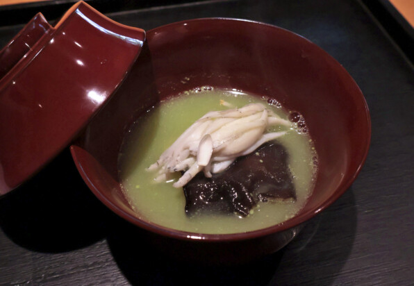 ●お椀は伊勢海老の葛たたき。ひめたけ。緑色のは「しおで」、山アスパラガスとも呼ばれるもので、山菜。柚子の花。