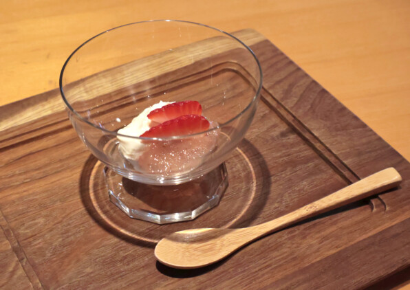 まずガラス皿でアヴァンデセールです。枇杷のゼリー寄せ、乳清クリーム。
