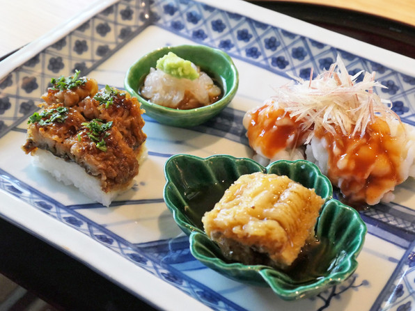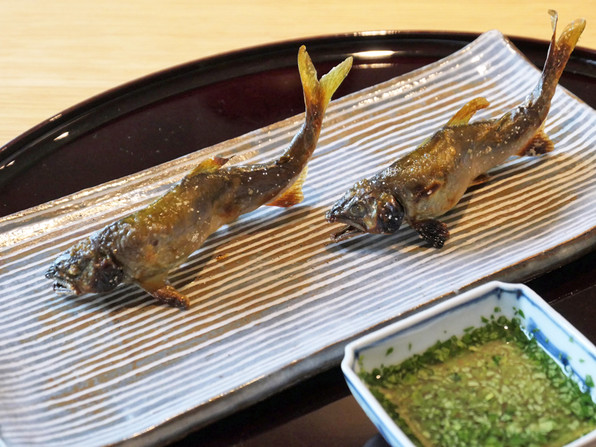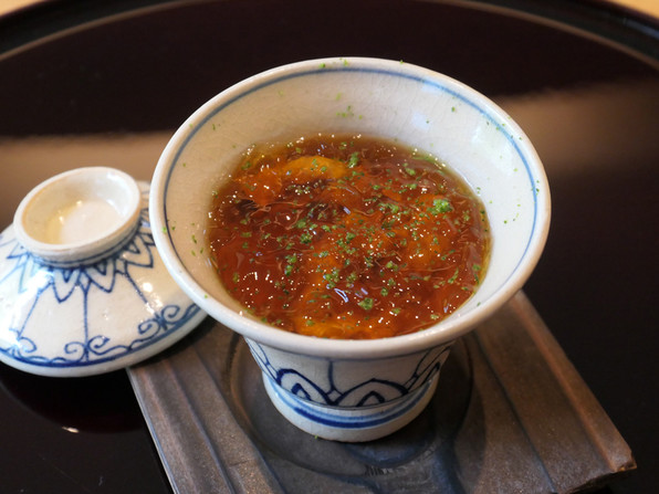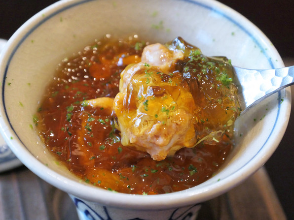 ●ひと皿め、あわびなのですが、これはさんまのづけ。少し濃いめのおだしジュレ。