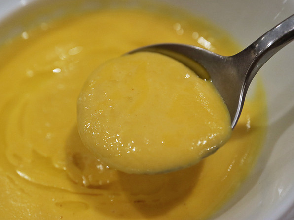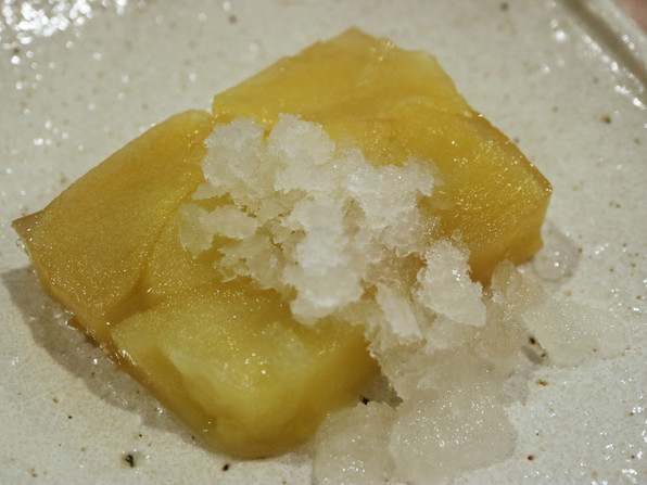 ●と思っていたら、三番手・羽生ゆずらない君(3回転してくれます)が、王林でデザートを作ってくれていました。フランスのりんごジュースから作ったソルベにタルトタタン風に炊いた王林。ラムの香り。