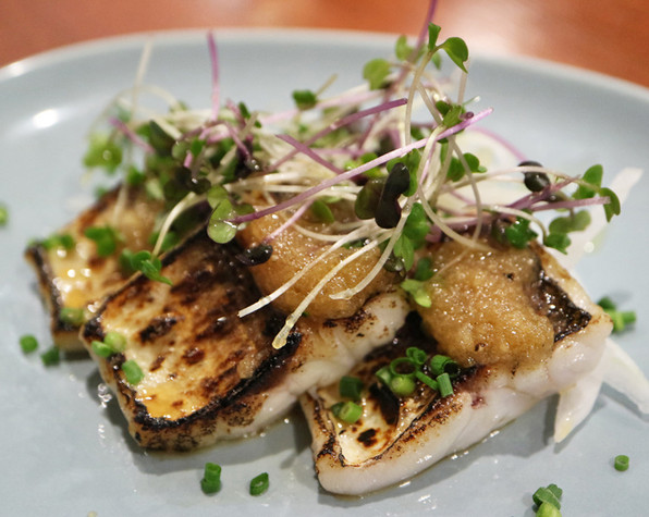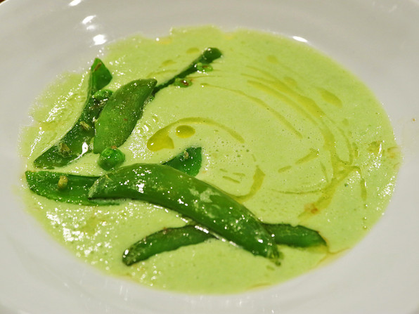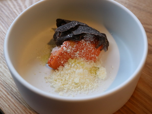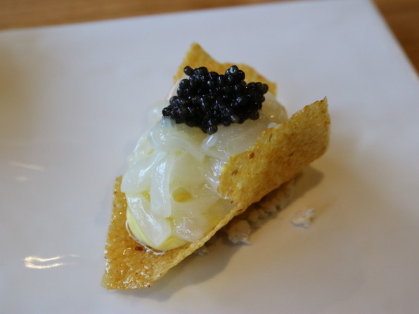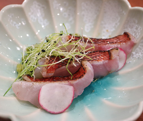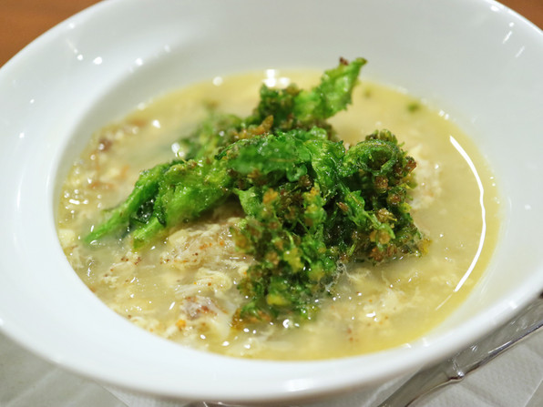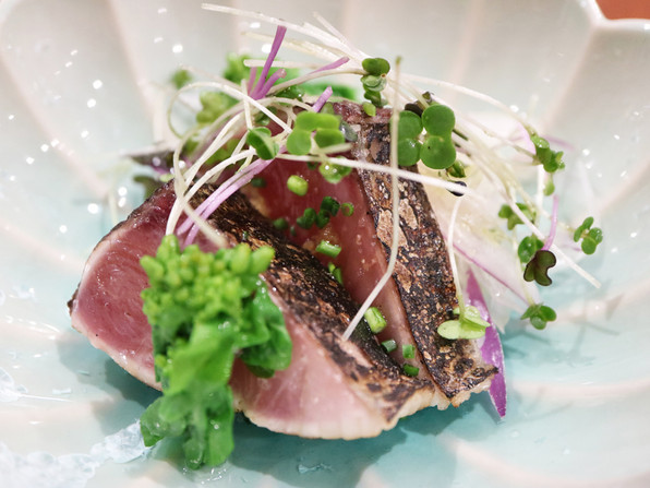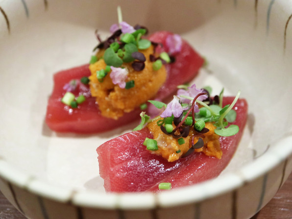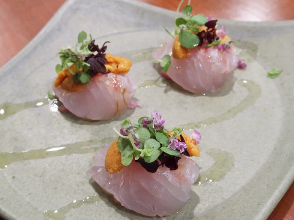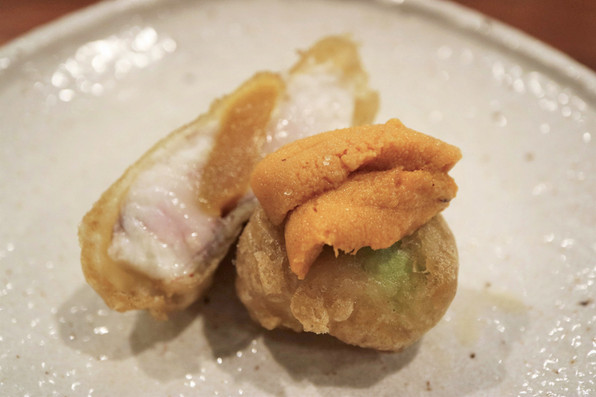 ●味噌漬けにしたからすみを射込みにしたいとよりの天ぷら、緑カリフラワーの天ぷら、上に雲丹。見事においしい。