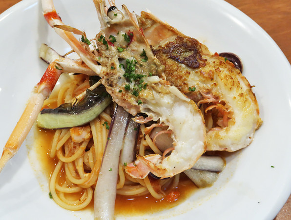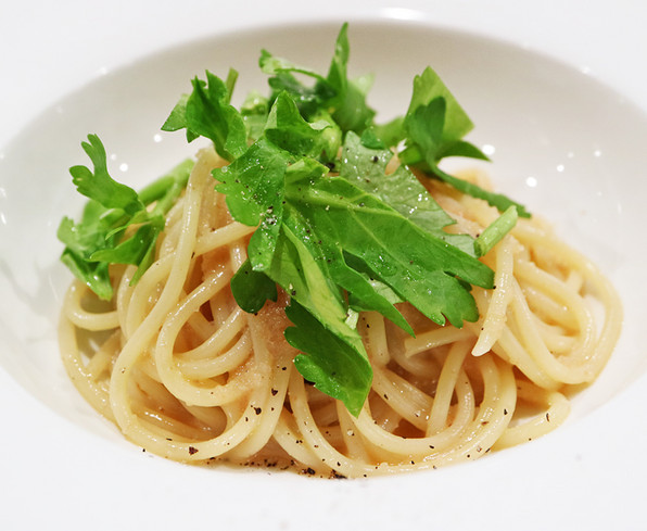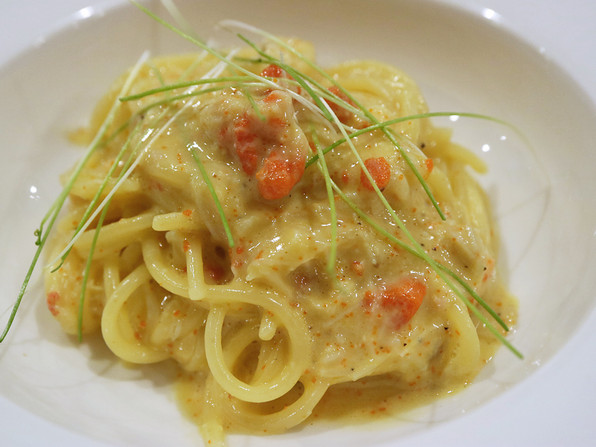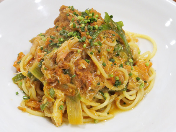●北海道から届いたたらこを使ったスパゲッティ。パスタは35g。上にセロリの葉。