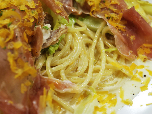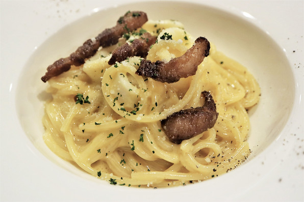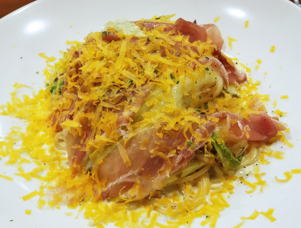 ●NP100、のろっちのパスタ100その78はカルボナーラ。なんと、やりいかとベーコン。一緒に行った人が烏賊好きで。「こんなの初めて」と言ったらのろっちも「作ったのも初めて」と。旨旨\(^o^)/