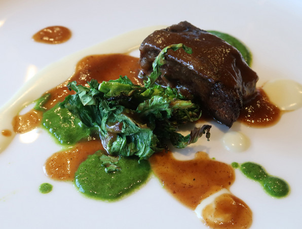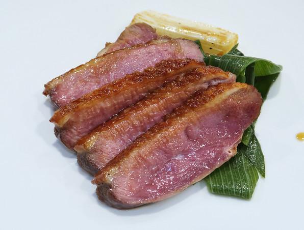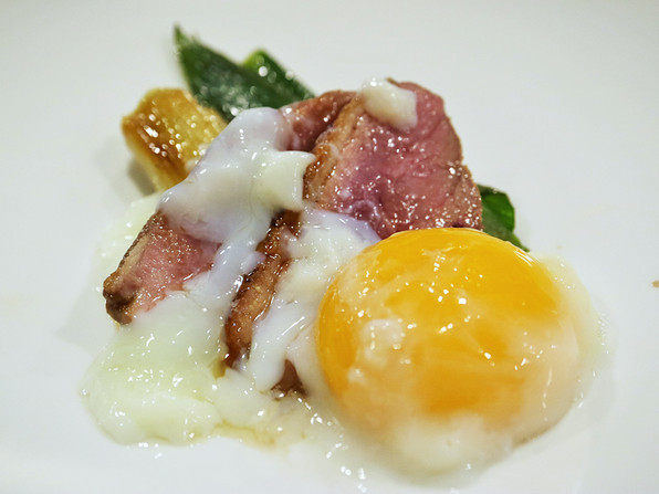 ●シャラン鴨、すき焼き風に甘辛くしたねぎと、温泉玉子と。