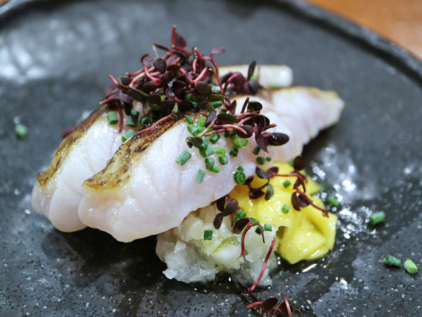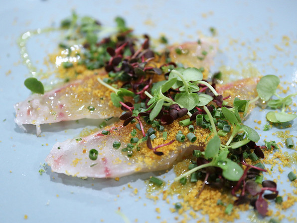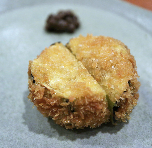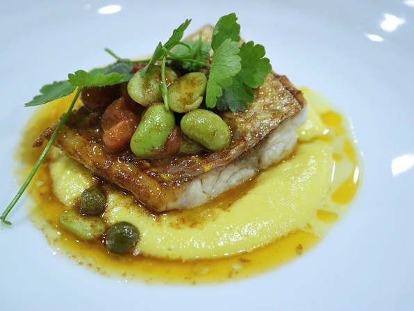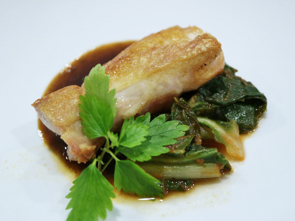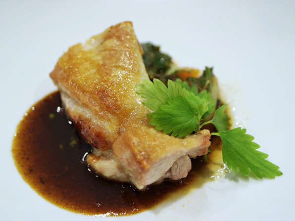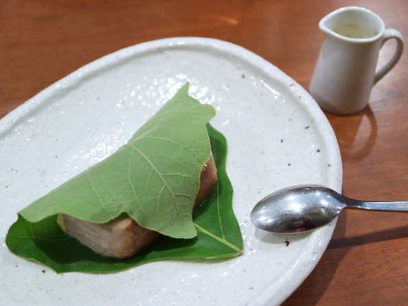 ●いとより焼いたの、ズッキーニピュレ、焦がしバター、タイム、ちどめ草(本当に血を止める薬草とされてきた草)