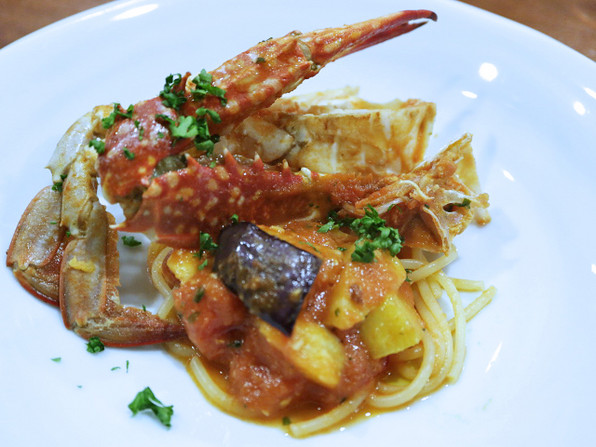 ●NP100=のろっちのパスタ100、その54もいきました。渡り蟹と賀茂茄子のスパゲッティ\(^o^)/\(^o^)/☆☆☆
