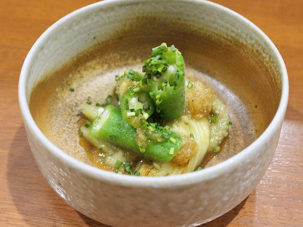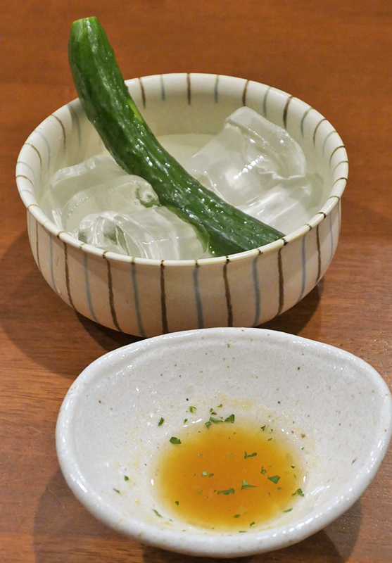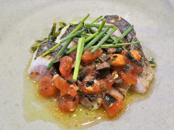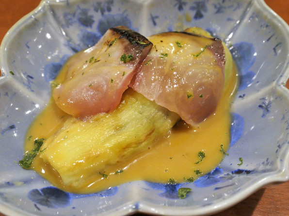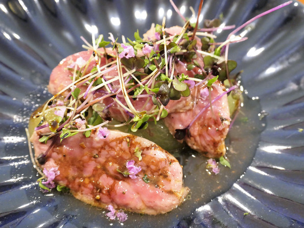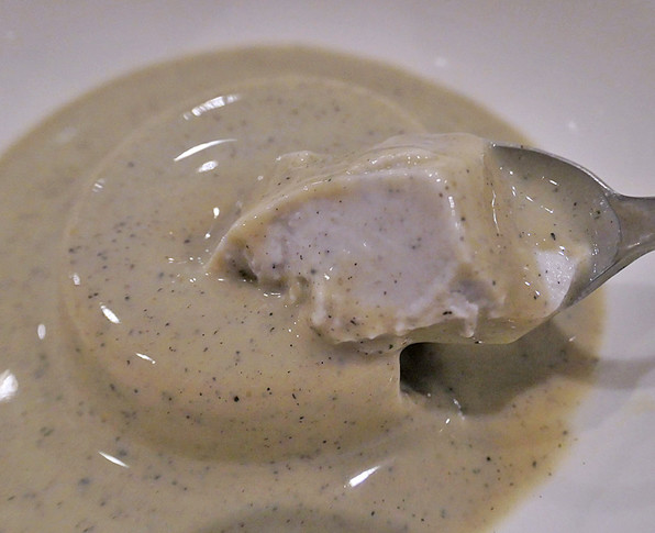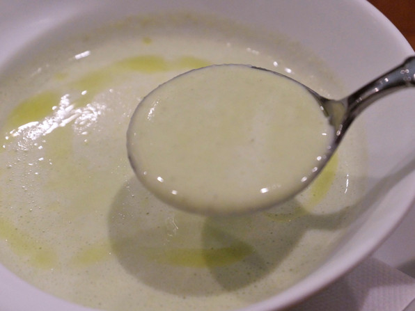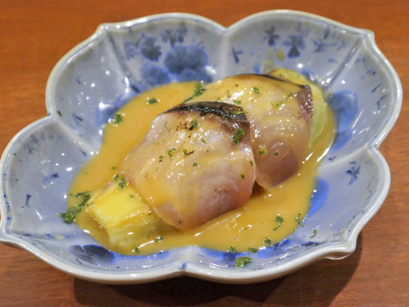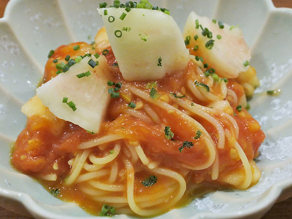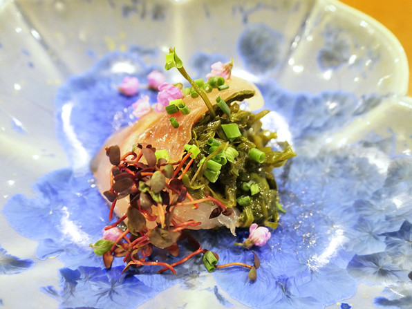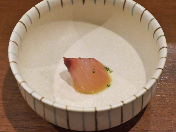 ●冷製の蕪のスープの後に、はま鯛の昆布締め、せりと。