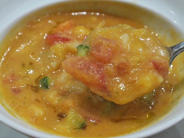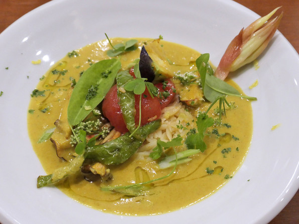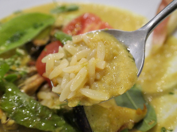 ●リゾーニカレー、まだまだ美味を重ねていきます。追いオマールがきて、さらにその後、玉ねぎ揚げ玉がキター\(^o^)/\(^o^)/