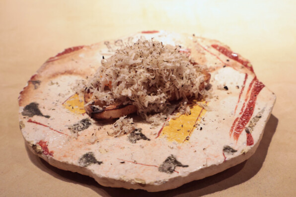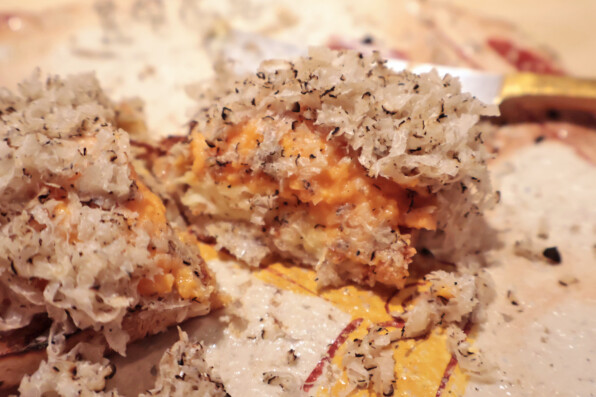 厚みのあるバターのスライスがのせられ、スクランブルエッグ、そしてサマートリュフがばさばさとおろしかけられました。