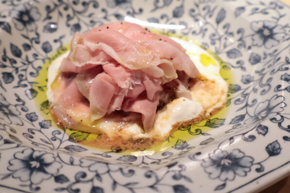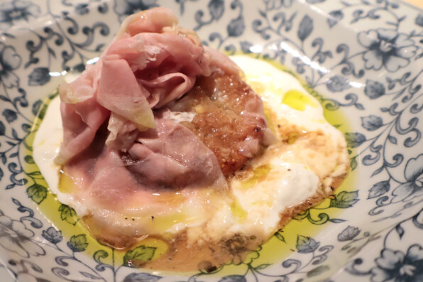 とろりんとストラッチャテッラが敷かれていて、その上に焼いて柔らかくなって、やっとこさ形を保っているような甘いいちじくに、塩気のハムがたっぷりと。