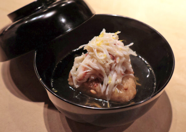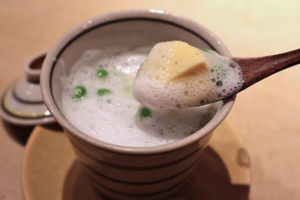 茶碗蒸し部分は理想的になめらかな舌ざわり。豆の香りと食感よく、からすみのさいの目切りが塩気のアクセントになってよい感じ。