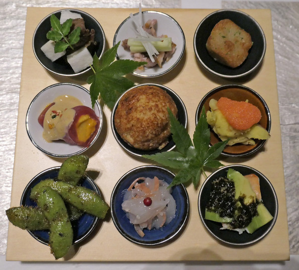 ●スープはまながつお、そうめん状に切った長芋、三つ葉のペースト、クレソン。だしはあこや貝から取ったということ。あこや貝とは真珠を作るために作られる貝ですね。すごくいいだしが出るということ。開けた時にパールが入っていることはないんだって。あっても非常に小粒で、宝飾品として使えるようなものではないらしいです。