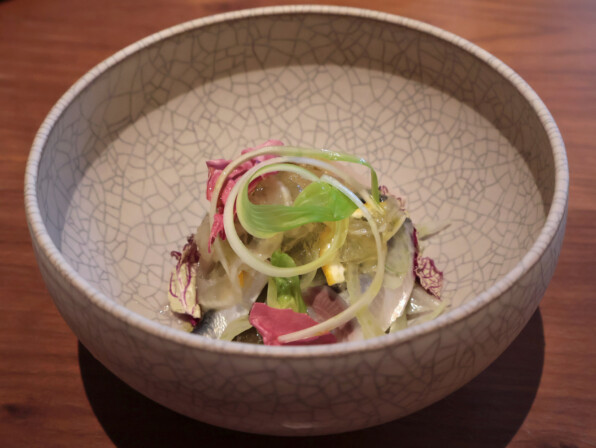 ●すずきは淡路島で揚がったものということ。分厚くて弾力がありました。そこに、おくら、つるむらさき、麺のように見えるのはズッキーニ、、などなど合わせて、野菜たっぷり、さらにトマトを目の前でソースにしてプッタネスカ仕立て。