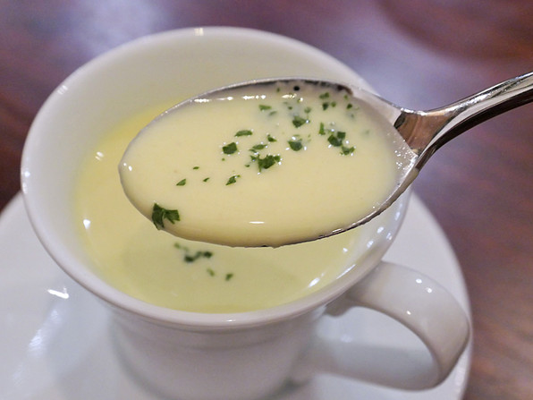 ●本日のポタージュ(=さつまいものポタージュ)、ブランケットドゥヴォー、海老ピラフといただきました。