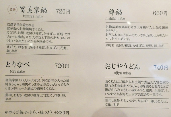 ●品書きは堺町通蛸薬師下ルの「冨美家」さんと少し違って、九条ねぎや京湯葉や丹波地鶏を使ったうどんを全面に出して、より京都らしさをアピールする品揃えになっていました。