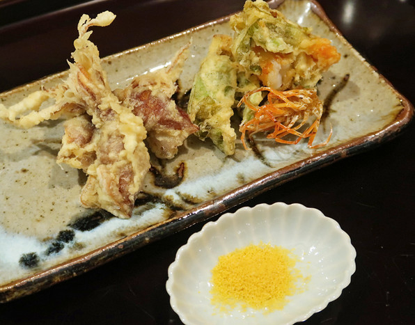 ●車海老と山菜のかき揚げ、ほたるいかの天ぷら