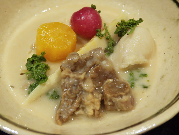 とりわけ、お椀(とり貝、じゅんさい、玉子豆腐)と、賀茂茄子と京鴨に花山椒をのせた炊き合わせに心を奪われました。