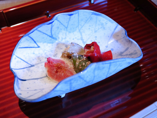 ●焼き茄子、万願寺とうがらし、いちじくに胡麻だれの先付。