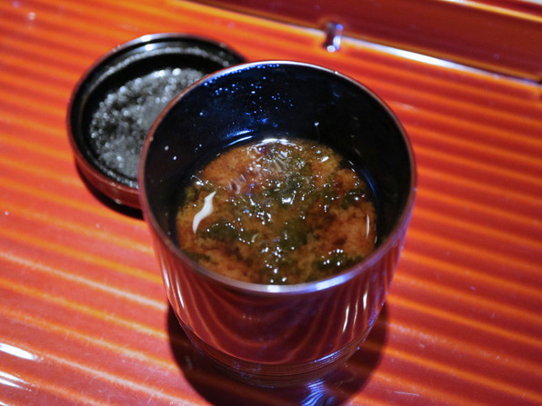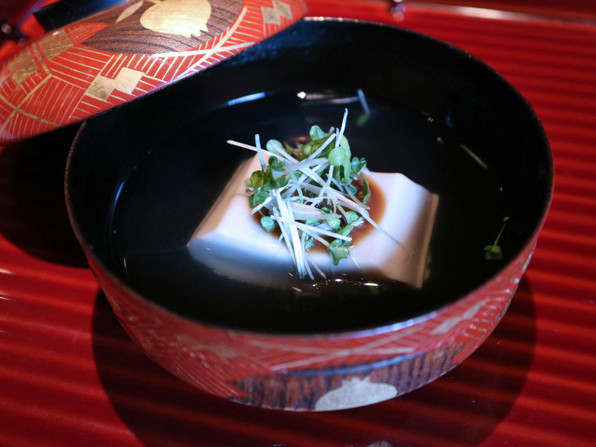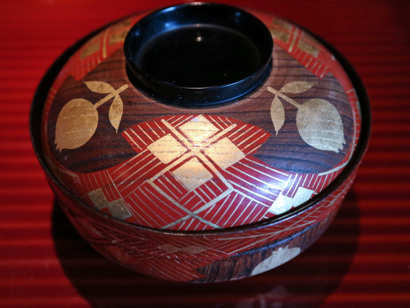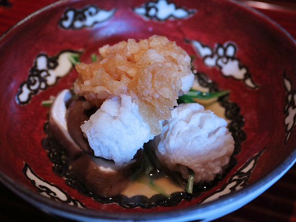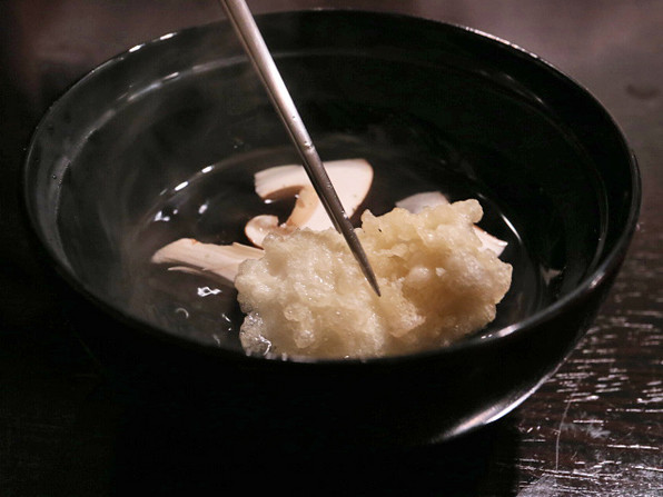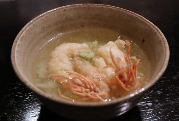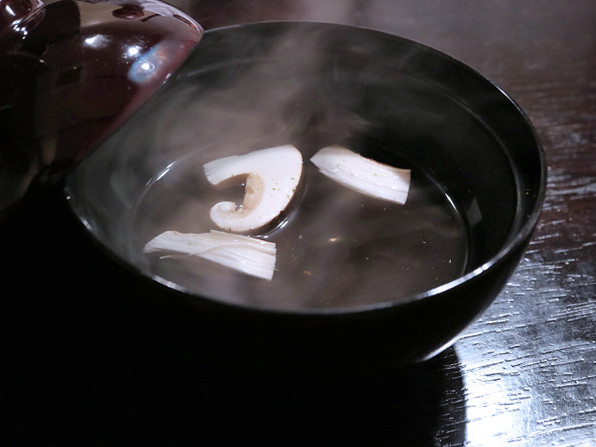 ●お椀が出てきて、松茸入りの吸い地をひと口飲んだら、揚げたての鱧天ぷらが投入されて、鱧松椀となる。非常に旨い。