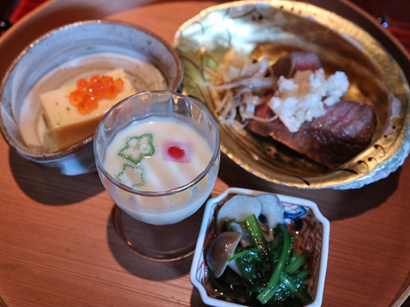 ●9席のカウンターに9人でお邪魔して、お料理8品に冷たいのと温かいのとお蕎麦両方、そして蕎麦茶わらび餅というコースをいただきました。