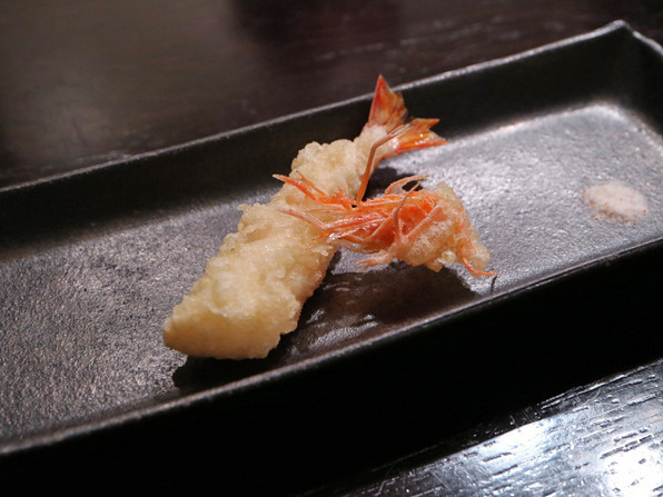 ●車海老は順当な姿で。うに塩と。海老はサクサクほくほくの、ジャストな揚げ加減。