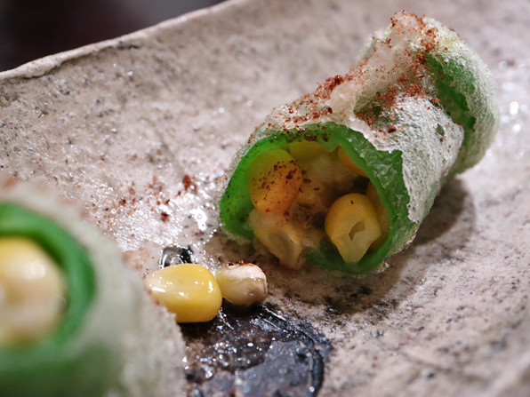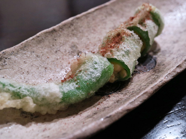 ●万願寺とうがらし。中にとうもろこしが仕込まれていて、色と食感のコントラストが楽しい。ごく薄い衣はサクサクサクで、上に、醤油風味スモーク塩。