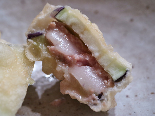 ●茄子の天ぷら、切った断面。サンドイッチ状で、中に鴨つくねとお餅入り!これが本当の「かも茄子」とのこと。茄子の厚みもつくねの量もお餅のねっとりも、すべてよき調和です。