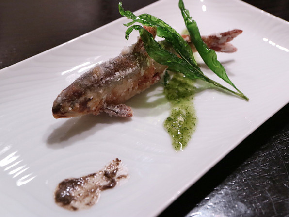 ●鮎の竜田揚げ。衣の食感がここまでの天ぷらと全く違う。スパイスも香りました・・・ガラムマサラ入りとのこと!たで酢ジュレはいちじく酢使用とのこと・・・限りなく仕掛けがありました。