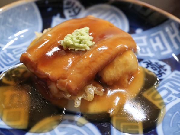 ●サクサク穴子天ぷらの上に煮穴子。穴子の2階建て。べっこうあんがとろりんと。穴子の甘辛味が好きな人には、たまらない一品です。