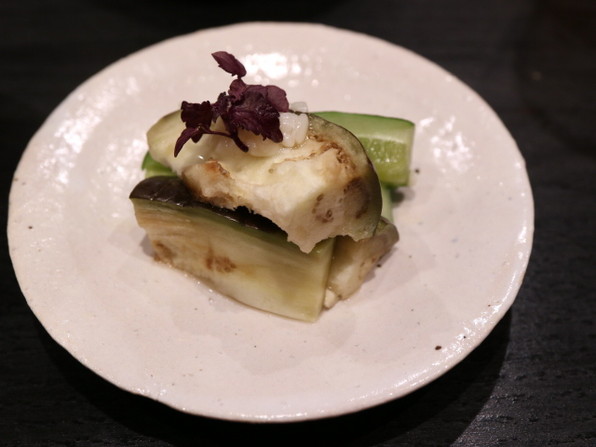 ●こちの天ぷら、上にきゅうりおろし、賀茂茄子の天ぷら、上から山椒醤油。