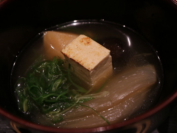 ●はじめの小さいお椀はすっぽんの玉締め、揚げた粟麩入り。