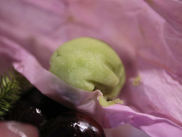 ●水物 果物、プリン、抹茶をまぶしたショコラ、ささげ豆のお菓子