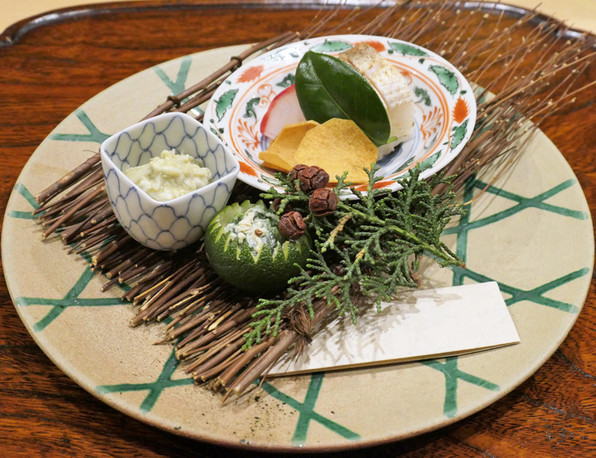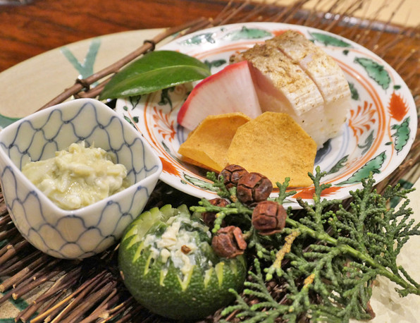 ●鯛肝ゼリー、からすみ、数の子粕漬、百合根に梅肉、鳴門金時煮、揚げ銀杏、いくら。