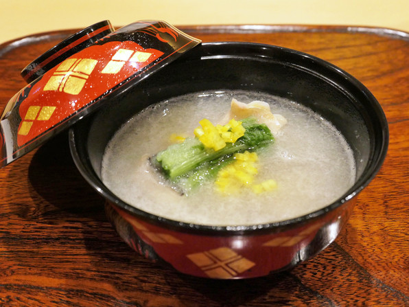 ●亀岡のかぶらを使ったみぞれ椀、白甘鯛、堀川ごぼう、水菜、あられ柚子。