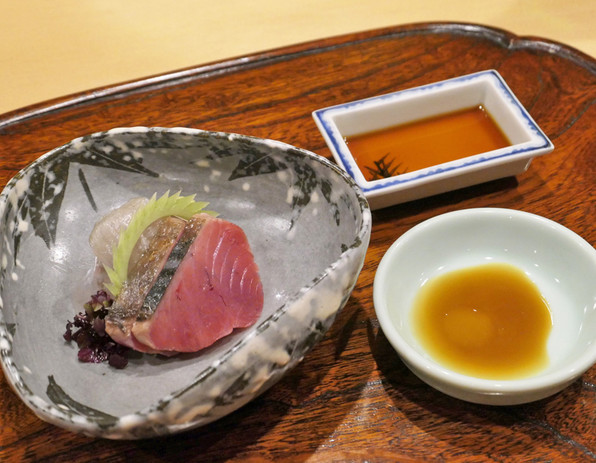 ●明石のひらめ、長崎のやいとかつお、炭でたたきにしたもの ガーリックオイルを垂らした辛子醤油で。