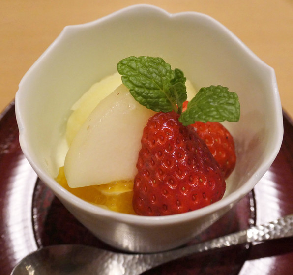 ●食後の甘味その1 麹豆腐。ブランマンジェのような食感。麹入りとのこと。豆乳ではなく生クリームと。上にレーズンを炊いたもの。