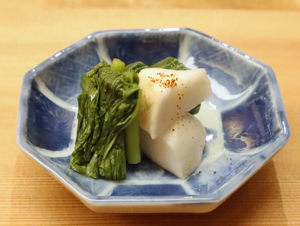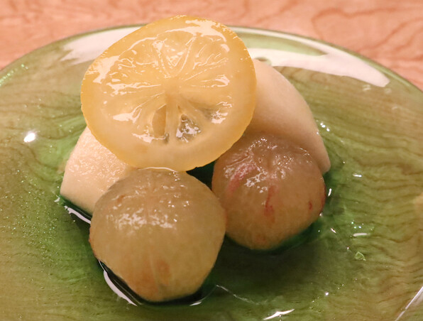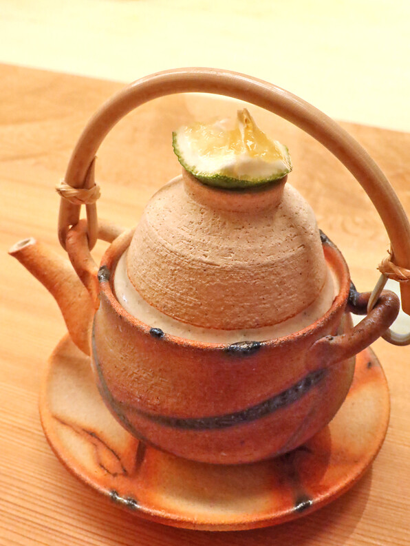 ●これがまたすごかった・・・青森からの蕪に、湯葉ではない、くるみのペーストです。焼いたら香り強すぎたとかで、生のくるみペーストということ。黒いのは油煮にした香茸ということで、トリュフオイルのような感じで使われていると。(ほんとすごい芳香でした。)くるみペーストは途中からはスープに溶いてくるみスープにしてねということ。蕪がこんなに旨いかくるみこんなに偉いか香茸こんなに香るかと、瞠目の思いでいただきました。