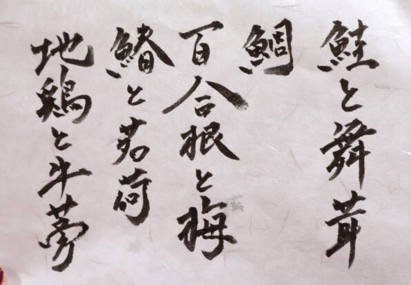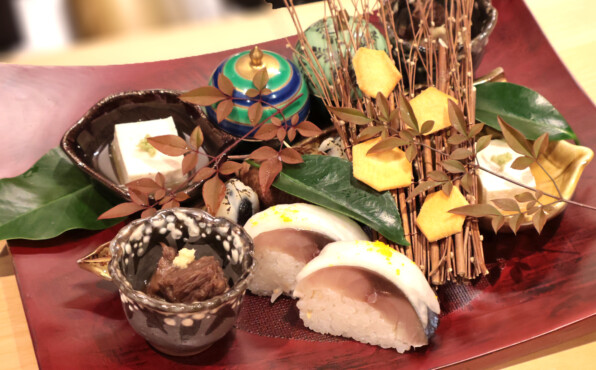 なまこみぞれ和え、菊菜お浸し、すけこ落雁、唐墨烏賊巻き粕漬け、スモークサーモン砧巻き、柿白和え、海老芋素揚げ
